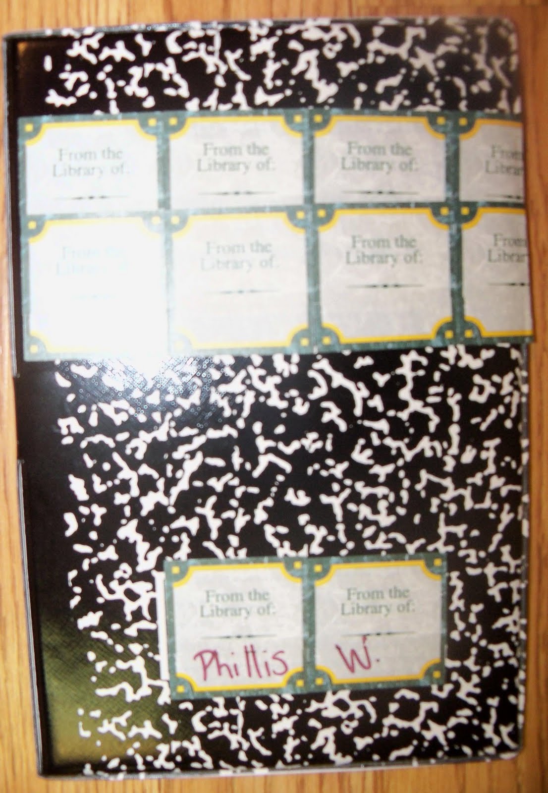 Here I used a small notebook that holds a pad of paper inside. I recycled stickers that I used to put inside my son's books that said: This belongs to.